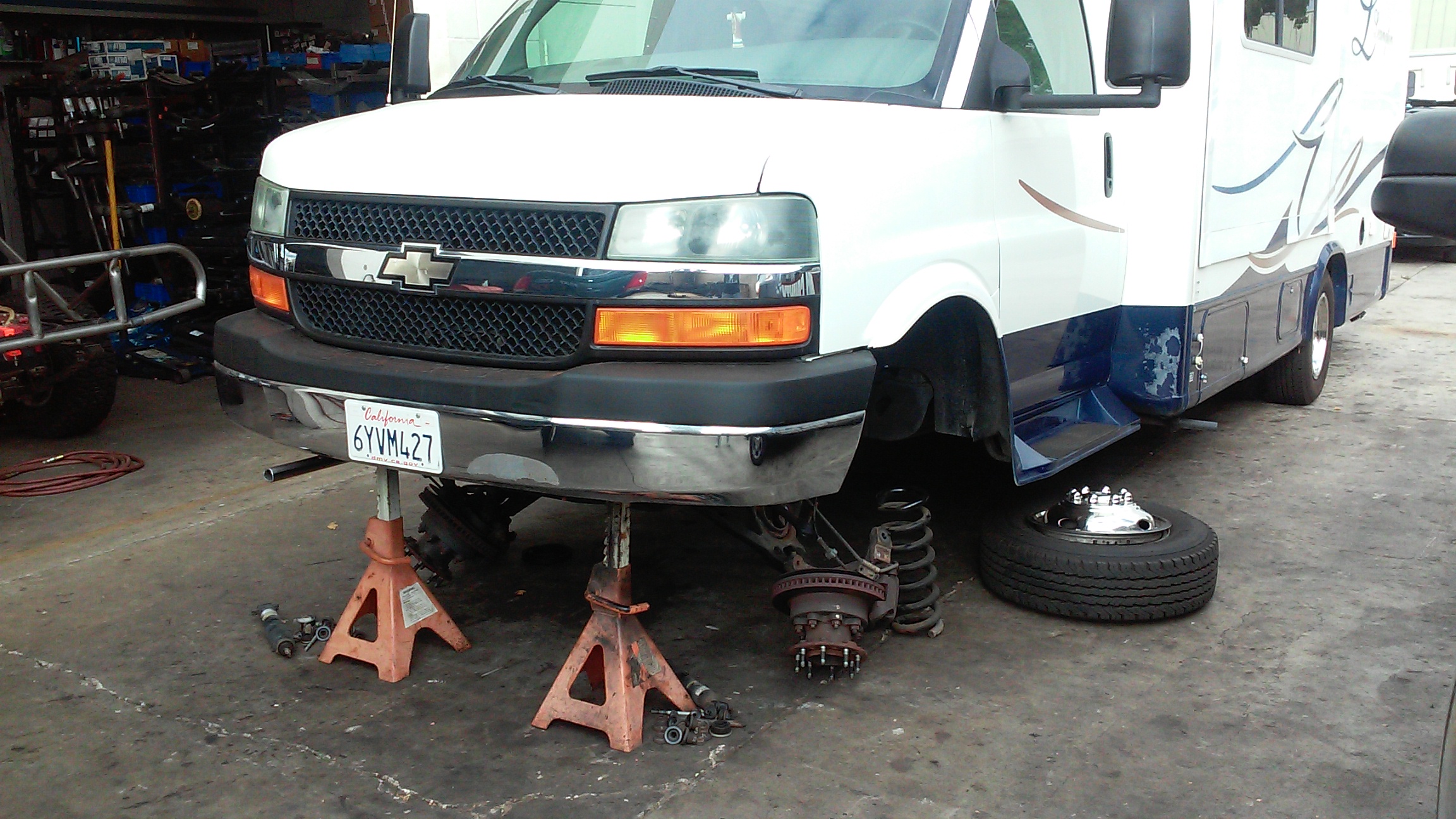 Next, I took out to a suspension shop in Escondido to have them raise the RV up a few inches to help avoid excessive scraping of the undercarriage on pot holed or dirt roads we will certainly be visiting on our travels. They also fabricated some skid plates and a brush guard for the front with a mounting place for a winch.